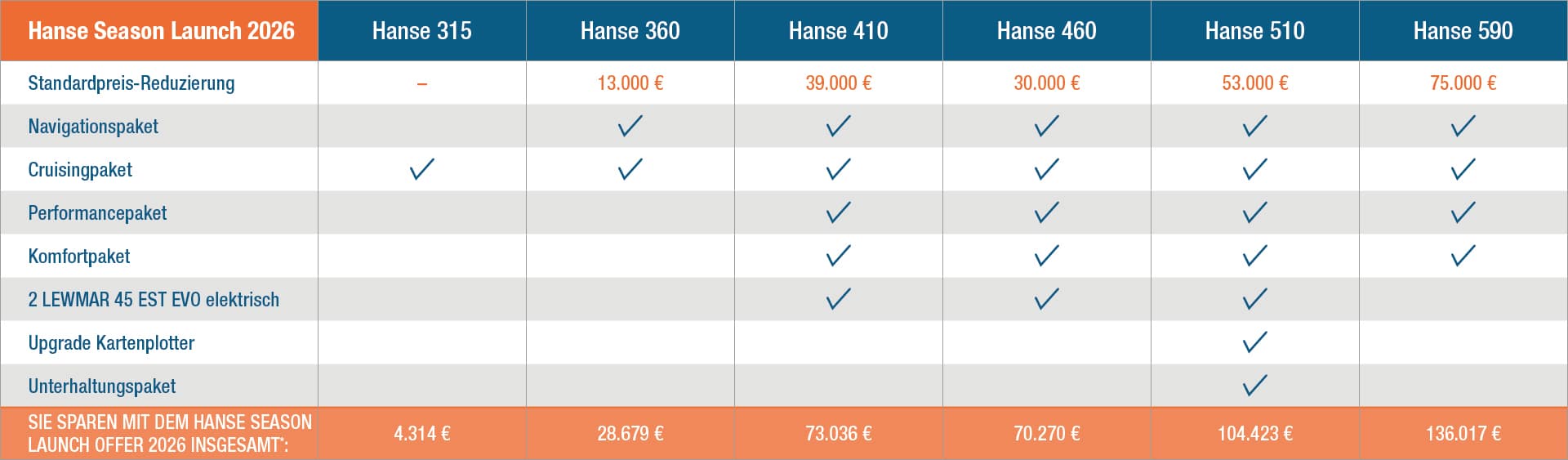 Finden Sie einen Händler(*) Disclaimer: Der angegebene maximale Preisvorteil basiert auf dem Modell Hanse 590 und gilt bis zum 15. Februar 2026. Vorbehaltlich der Produktionspläne, in Einzelfällen ist eine frühere Lieferung möglich. Alle Preise und angegebenen Preisvorteile enthalten 19 % deutsche Mehrwertsteuer. Preise und Rabatte für andere Märkte können je nach geltendem lokalen Mehrwertsteuersatz variieren. Die in diesem Angebot enthaltenen Optionen sind nicht umtauschbar und nicht erstattungsfähig. Nicht ausgewählte oder nicht genutzte Optionen können nicht gegen Bargeld oder Preisnachlässe eingetauscht werden. Dieses Sonderangebot kann nicht mit anderen Werbeaktionen, Rabatten oder Incentive-Programmen kombiniert werden. Alle Angaben ohne Gewähr. Irrtümer und Auslassungen vorbehalten.